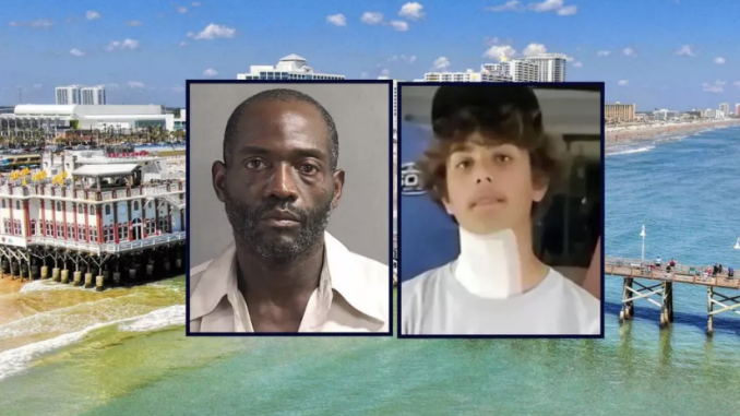 A 13-year-old boy who was enjoying an evening on a Florida boardwalk during his family’s vacation had his throat slashed in a random attack that nearly killed him, authorities in the Sunshine State say.